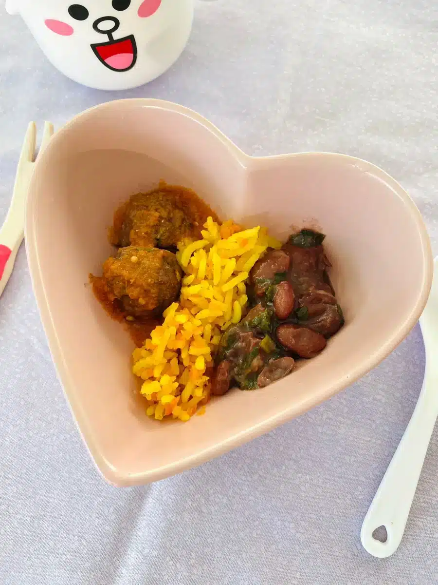Marmitinha: almôndega de carne à bolonhesa, feijão vermelho e arroz com cenoura e cúrcuma. SEM SAL CONGELADO Embalagem: 180g