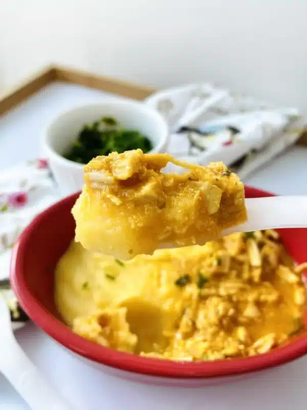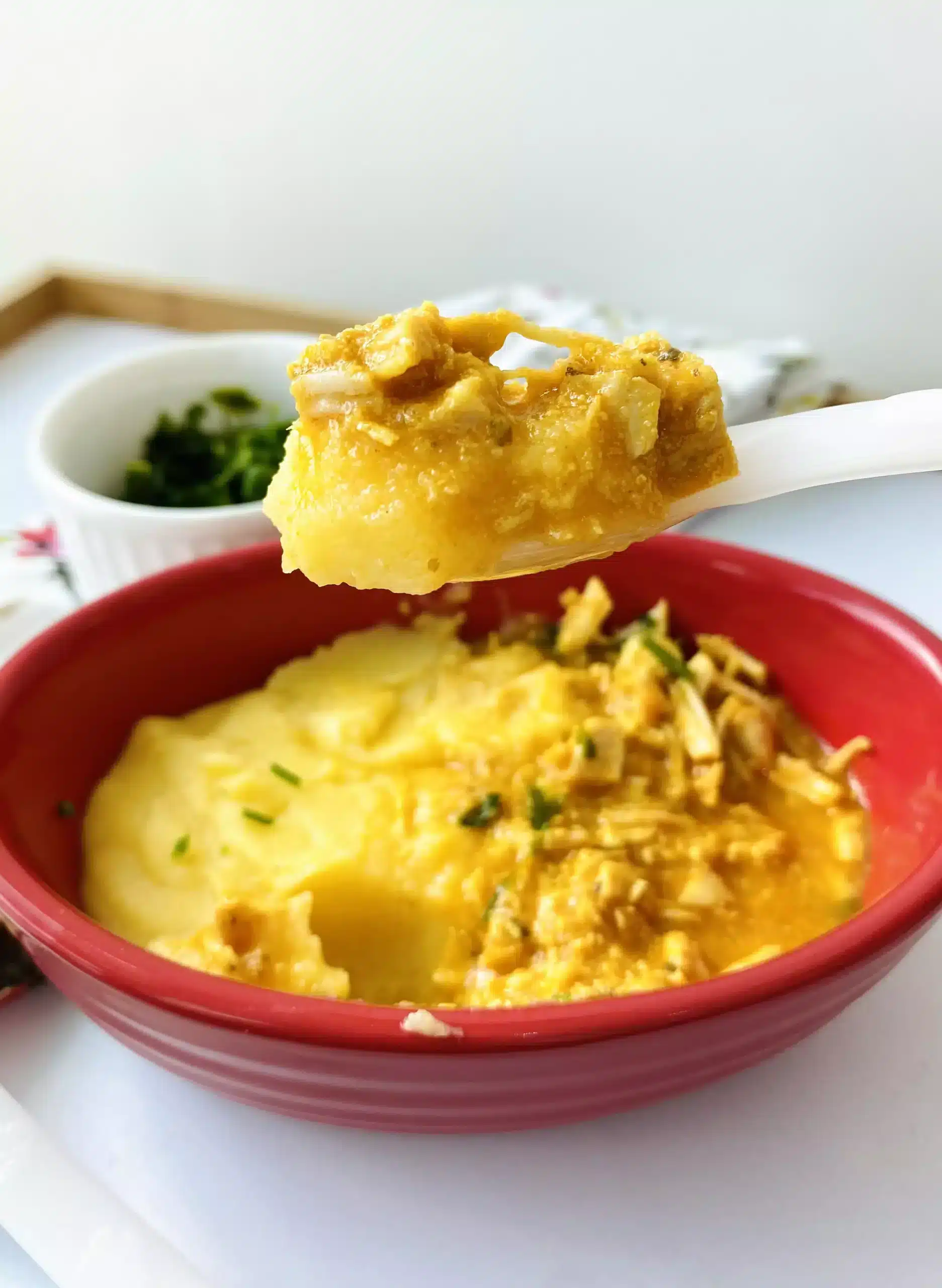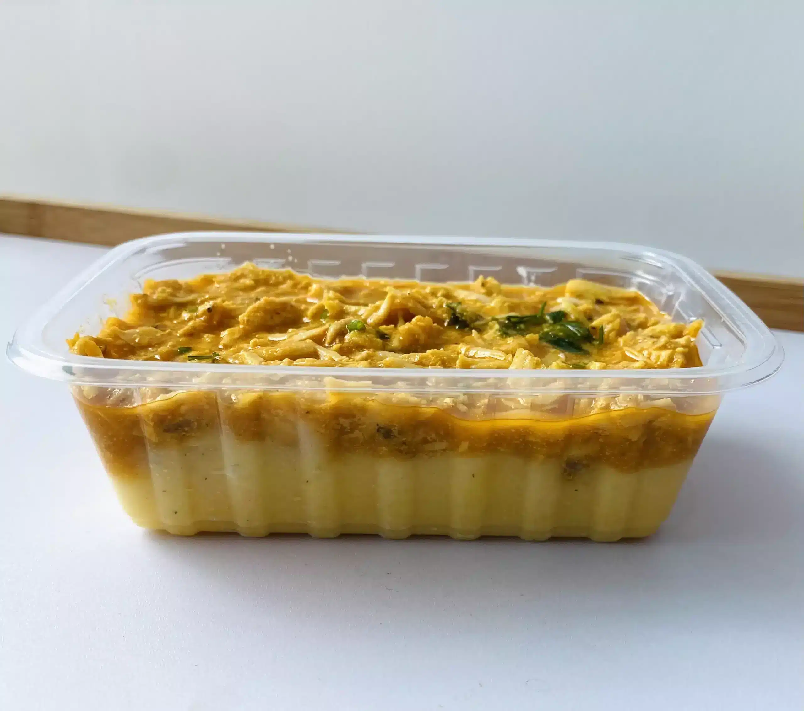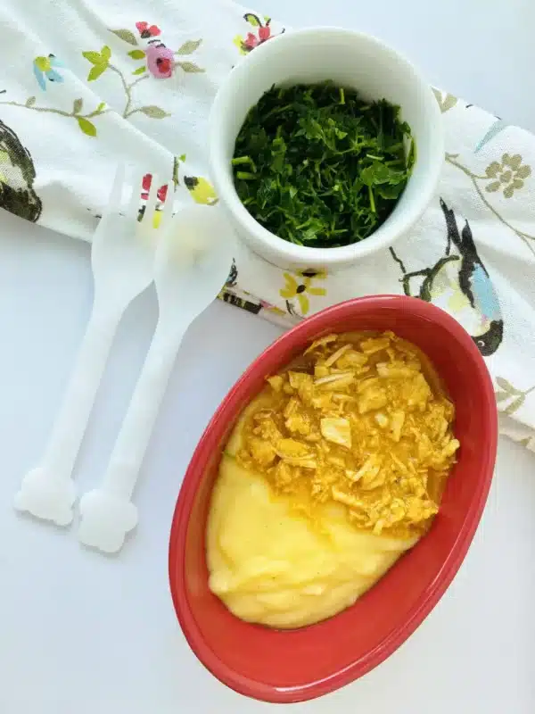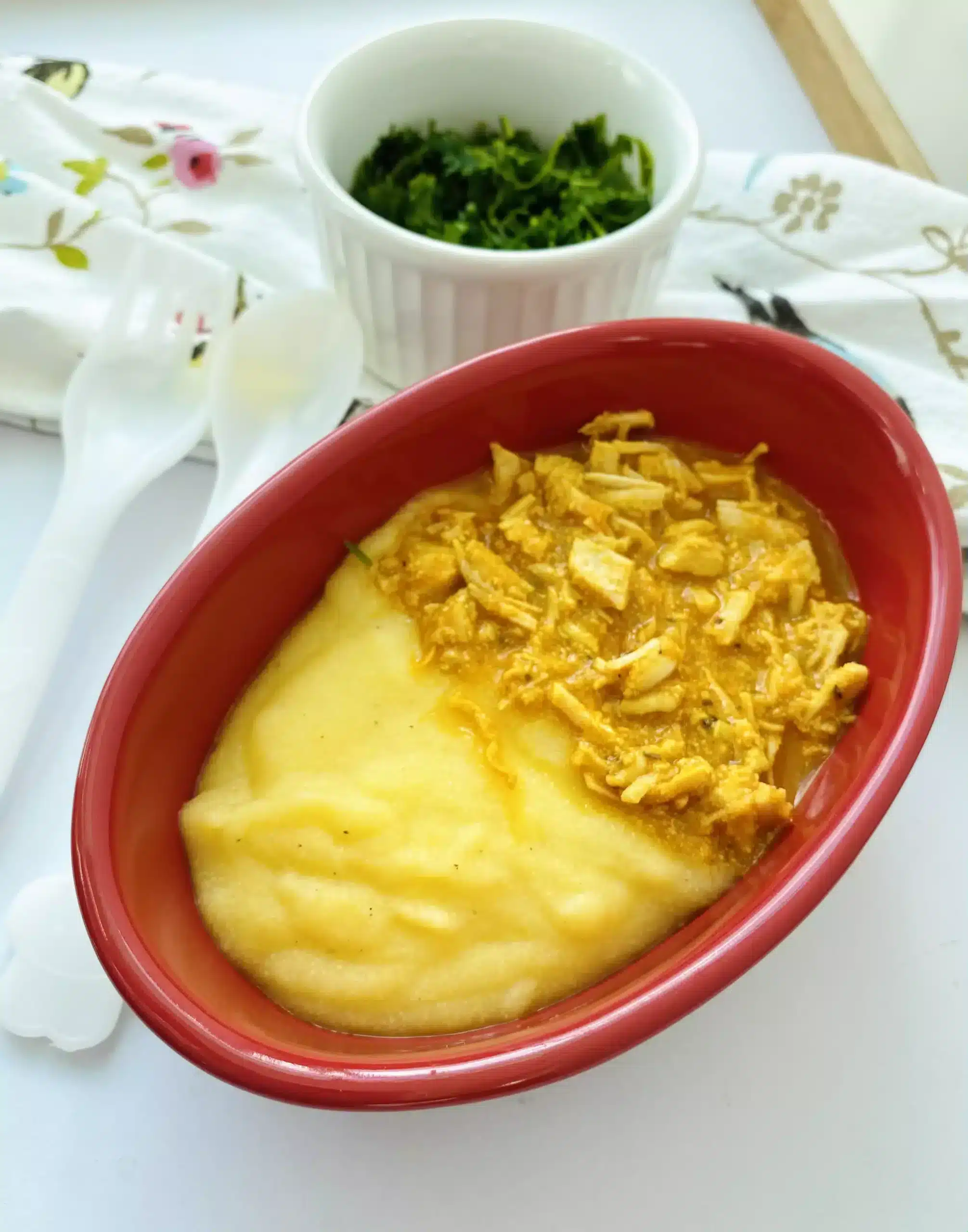 Polentinha de fubá orgânico com peito de frango ao molho.